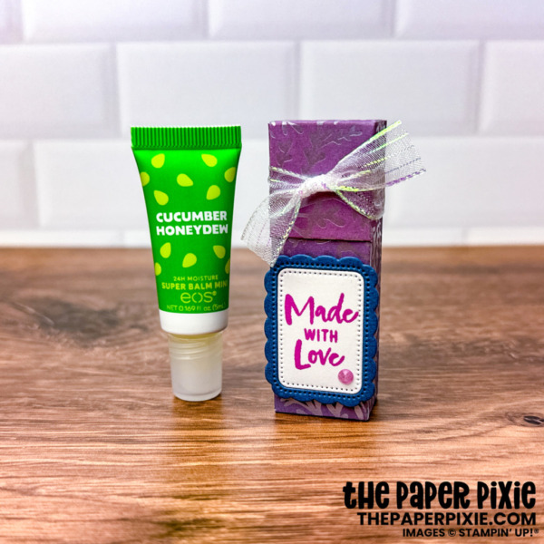 Today’s project is a Flip-Top Gift Box for a lip balm! I designed this for the EOS Super Balm Minis, but it will also fit many other brands of lip balm! This unique style gift box is a fun way to package up a lip balm for a gift – or even rolled up cash or a check for the perfect gift!